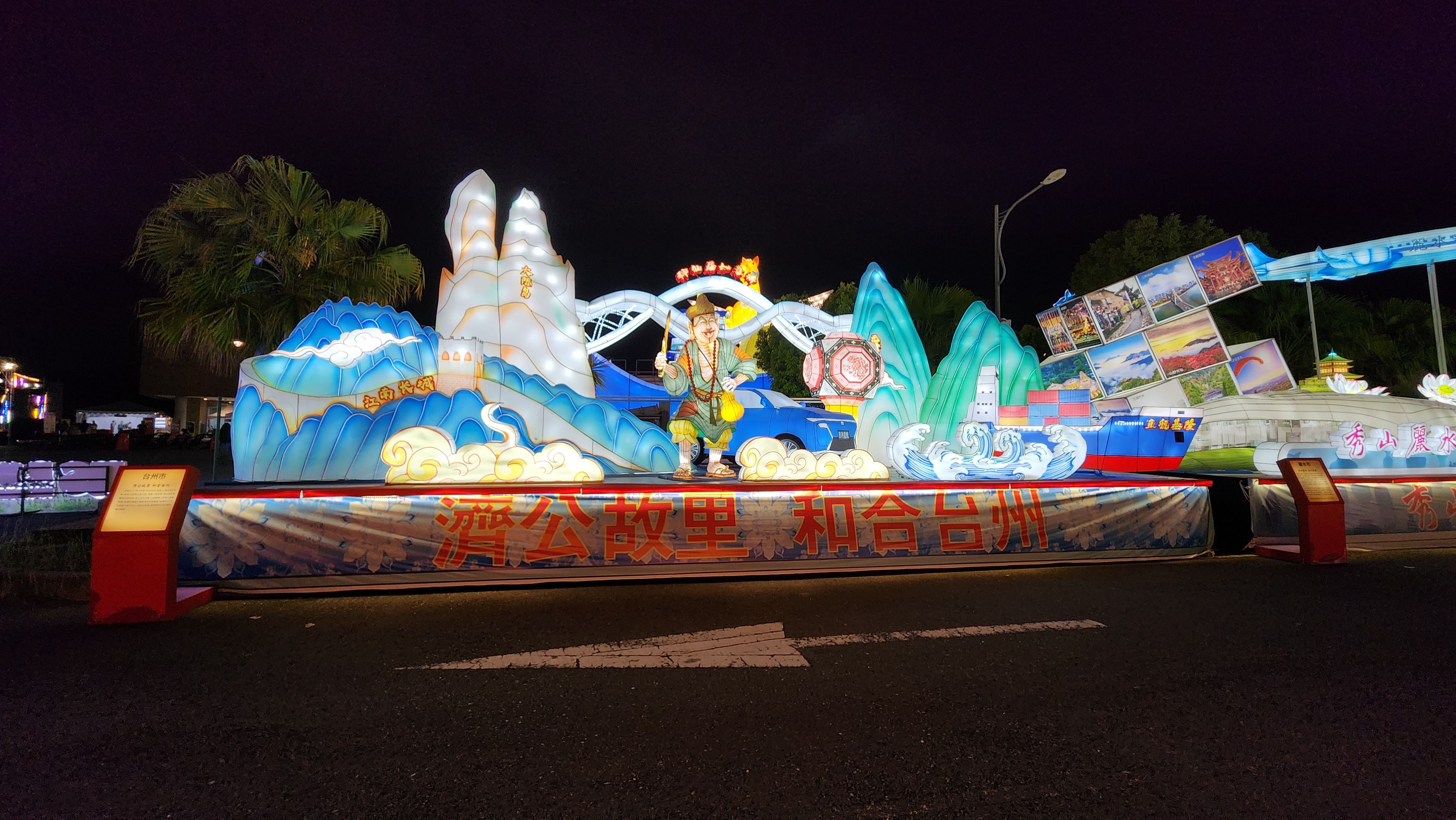 本設計以「濟公故里,和合台州」為核心,融合濟公形象、無骨花燈等非物質文化遺產符號,串聯江南長城、神仙居如意橋等文旅地標,嵌入吉利汽車、大麥嶼港口等現代產業標識,藉由傳統福韻花燈與海浪祥雲意象,詮釋台州「文化根脈+時代活力」的和合氣質,展現城市古今交融的獨特風貌。