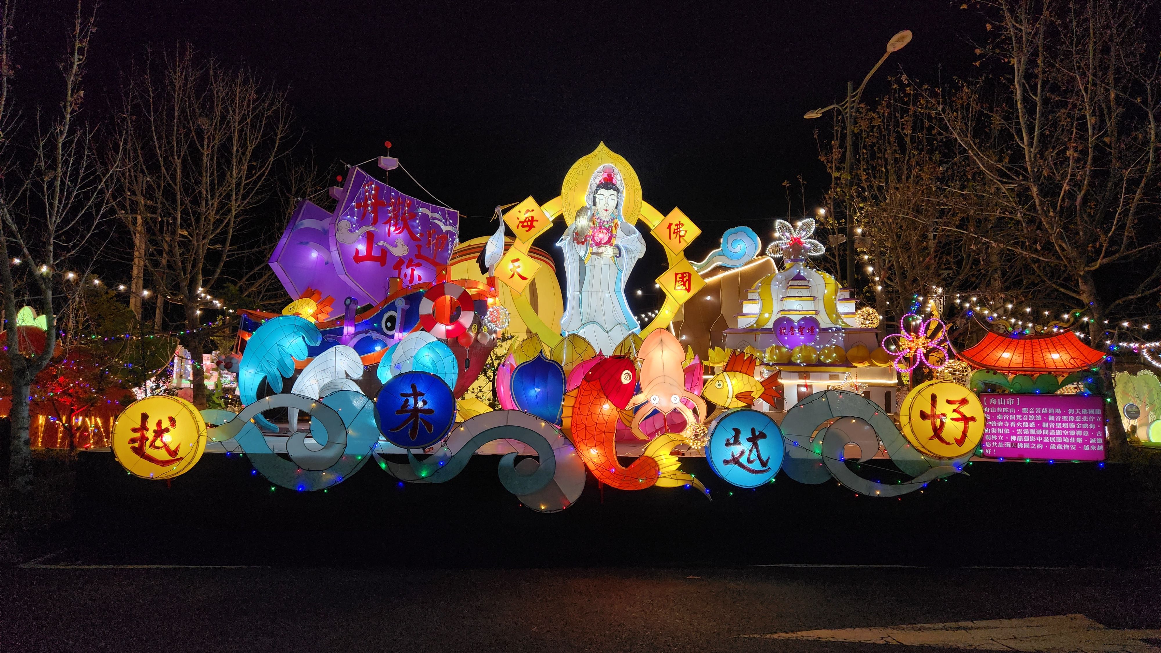 燈組中央以雪竇山彌勒聖壇的歡喜彌勒為精神核心,知足常樂的笑容寓意祥和與祝福。彌勒寶相端坐瑞雲與金元寶間,象徵「福氣滿滿、眾善集聚、歡喜無量」,也展現寧波作為彌勒文化發源地的重要精神標誌。