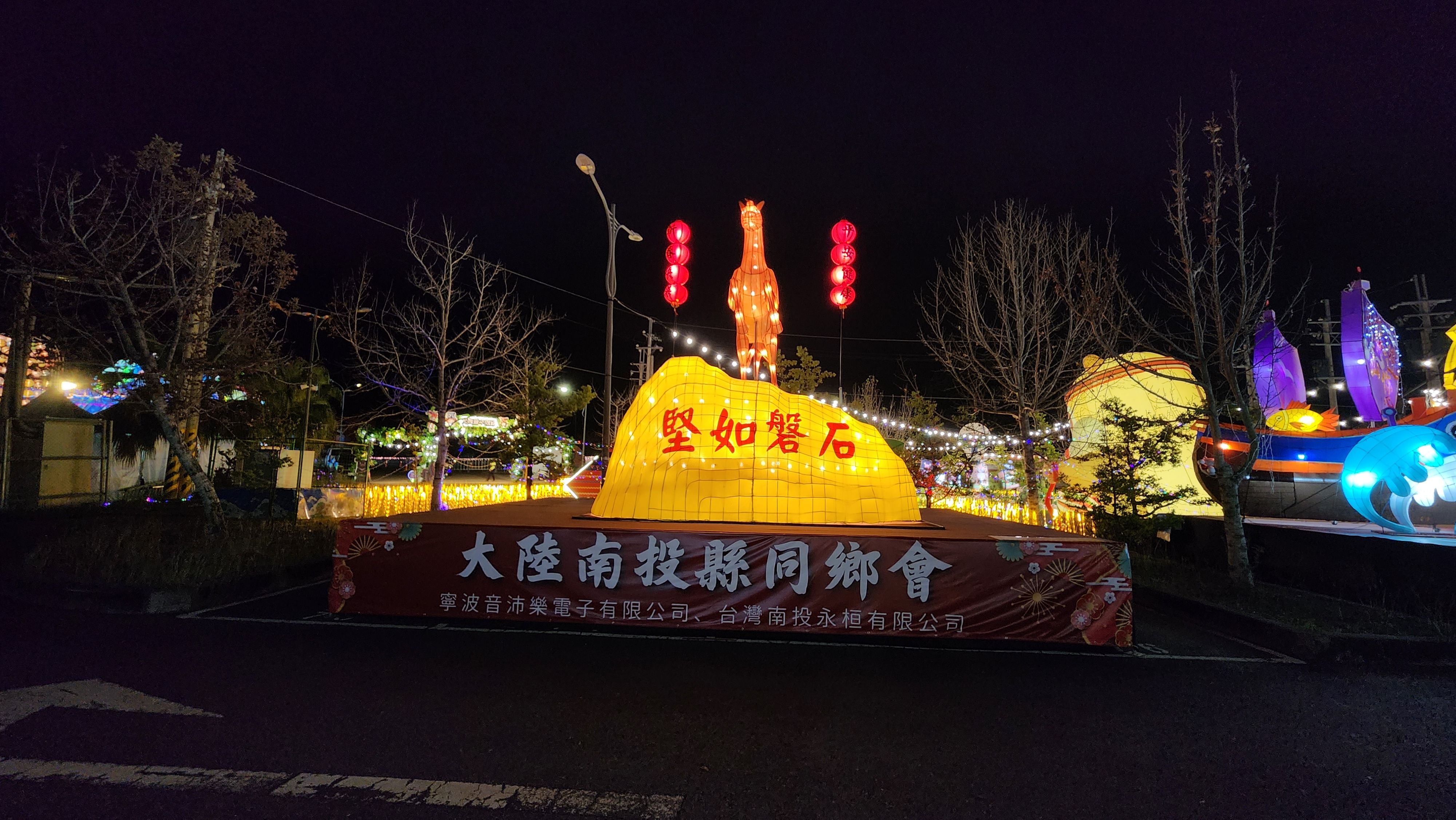 磐石之上,金馬昂首躍立,取馬作為行動與延展的象徵,寓意文化脈絡隨時間推移不斷前行,展現向上精進的生命力。作品兩側懸掛「新春快樂」、「平安健康」祝福燈籠,結合紅燈與書法意象,呈現華人年節文化的熟悉符號,傳遞對民眾的美好祝願。整體以金黃與大紅為主色,營造溫暖喜慶的節慶氛圍。