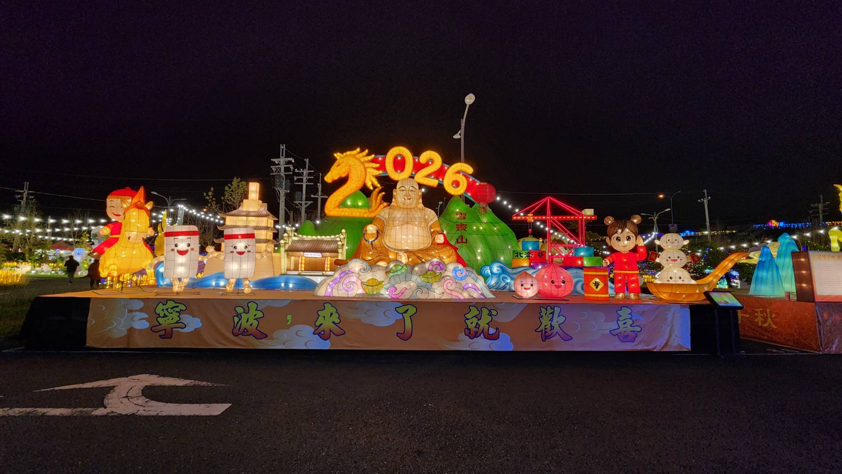燈組以「歡喜、吉祥、幸福、平安」為核心精神,結合2026 馬年意象、寧波城市特色與雪竇山彌勒文化,打造象徵新年福運與美好祝願的迎春視覺。