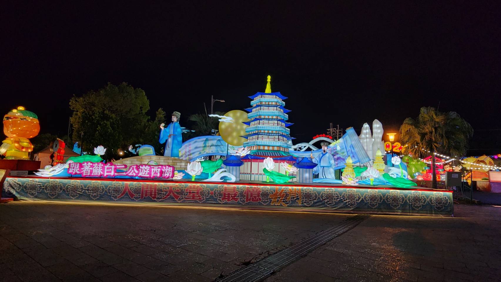 本次杭州展區以「東坡詩意•樂天杭州」為主題,生動呈現白、蘇二公的經典形象,巧妙融入「未能拋得杭州去,一半勾留是此湖」、「欲把西湖比西子,淡妝濃抹總相宜」等傳世佳作,並融合西湖、雷峰塔等代表性景觀,構圖呈現上以西湖為底,雷峰塔高聳向上。整體設計美觀大氣,結構緊密,既彰顯詩意的人文情懷,又彰顯杭州作為歷史文化名城的獨特魅力。