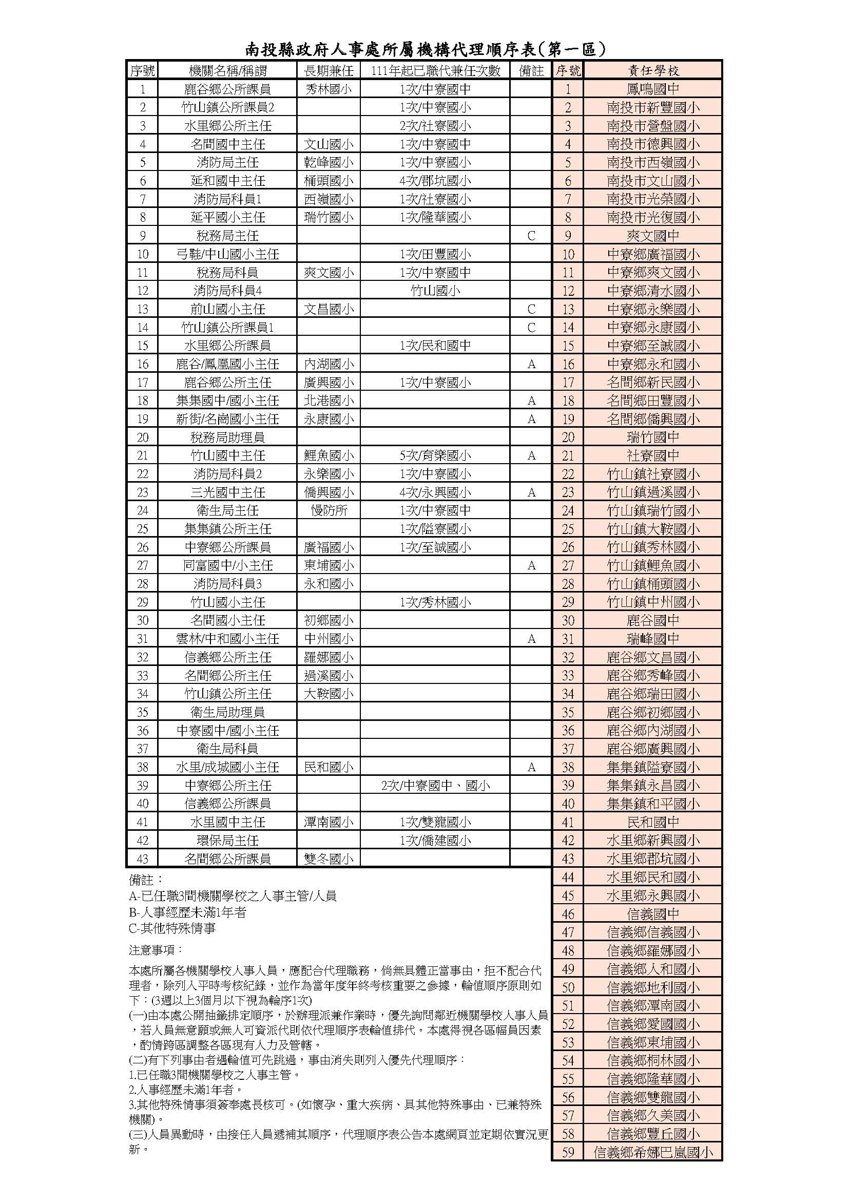 人事處所屬機構代理順序表第一區