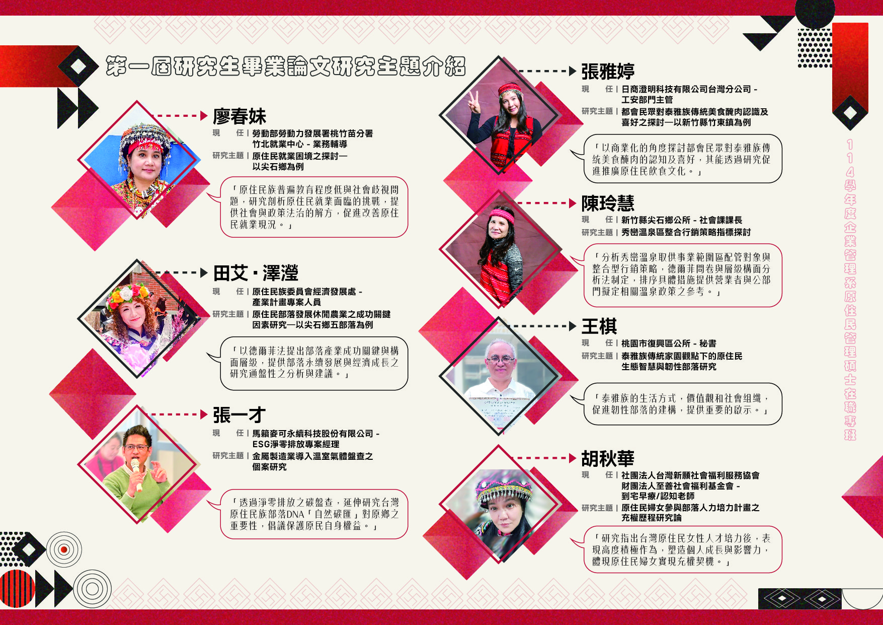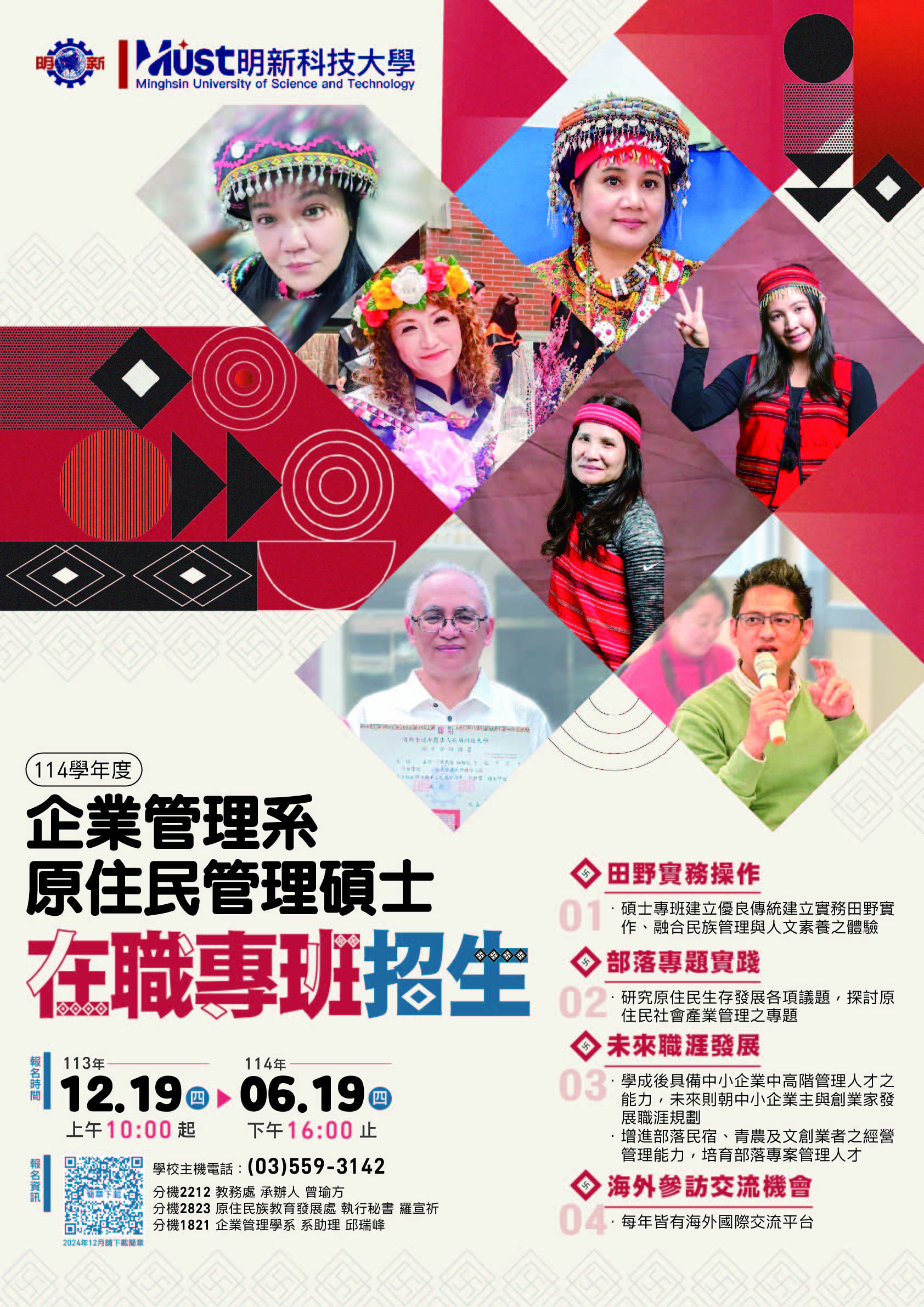 | 主旨: | 檢送本校114學年度「企業管理系原住民管理碩士在職專班」簡章暨DM海報一式,惠請公告周知,請查照。 |