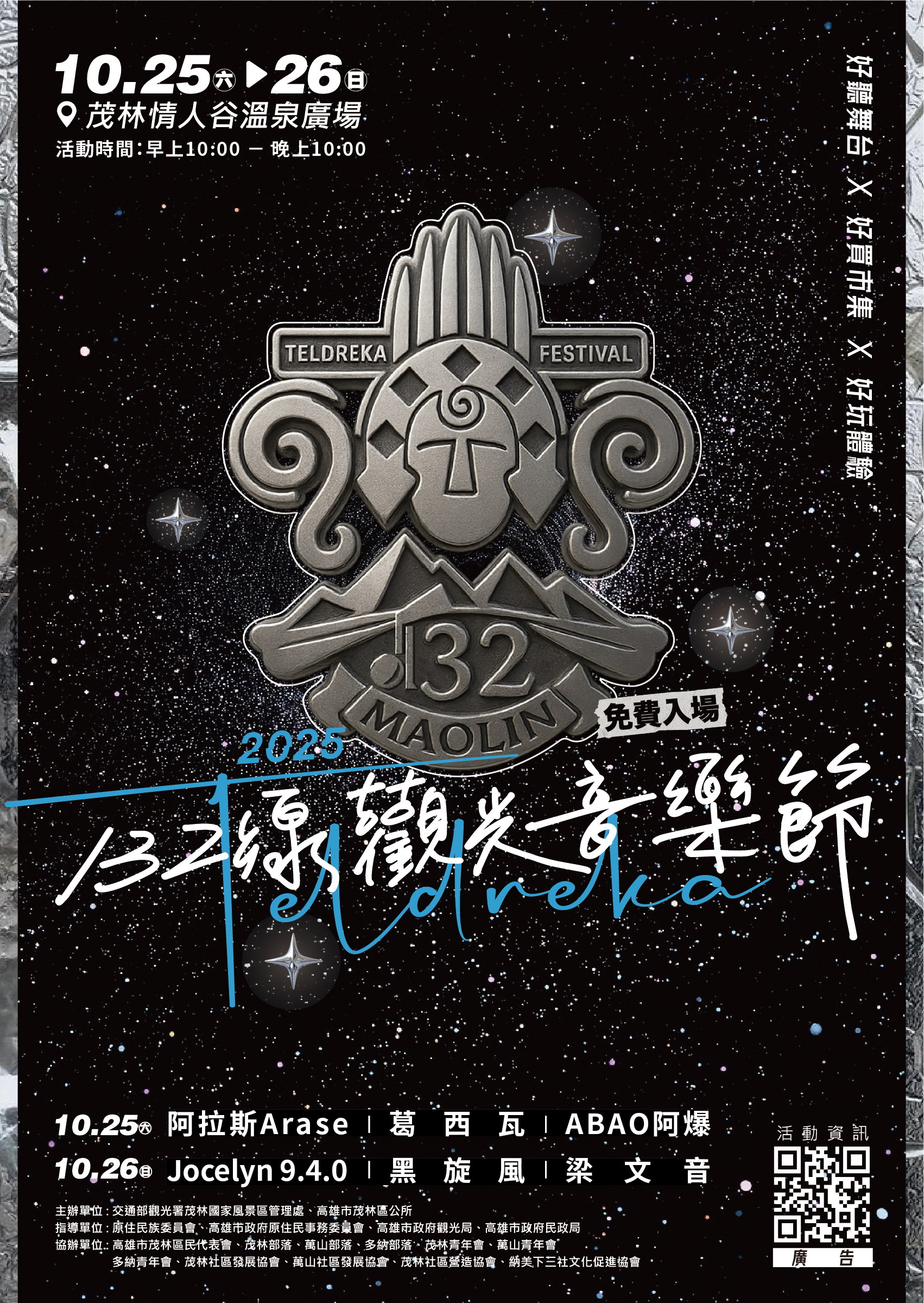 一、本活動訂於114年10月25日(六)至26日(日)上午10時至下午10時於茂林情人谷溫泉廣場辦理,內容有市集活動、舞台 演出、手作體驗、文化策展及遊程活動等。
