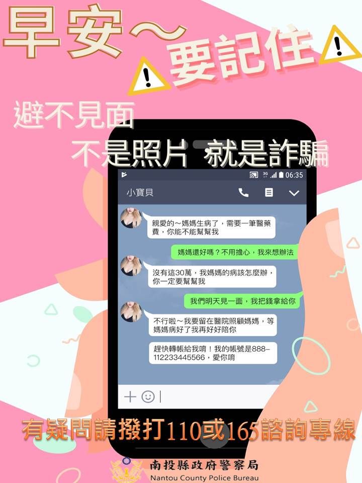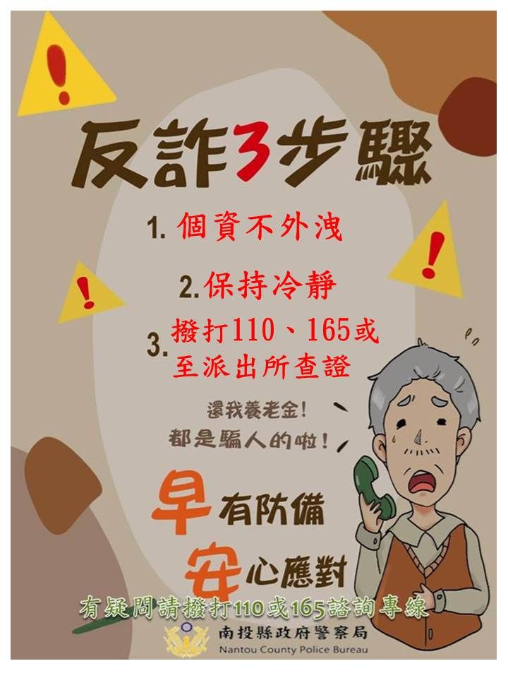 南投縣政府警察局反詐騙宣導,宣導短片連結如下:https://fb.watch/fnGo_ARDQr/