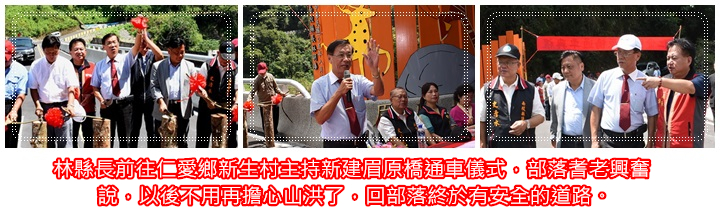 縣長林明溱9月13日前往仁愛鄉新生村主持新建眉原橋通車儀式,原民會經建處副處長章正文、議員廖文賢、史清水、石慶龍、林芳伃、許阿甘、簡賜勝及鄉長江子信等都到場共襄盛舉,場面相當熱鬧。部落耆老興奮說,以後不用再擔心山洪了,回部落終於有安全的道路!
