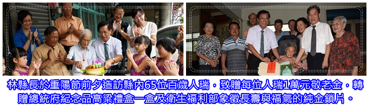 縣府為表達對本縣百歲人瑞的祝福,於9月26日至10月6日重陽節前夕,由縣長林明溱帶領社會及勞動處長林俊梧及同仁分組造訪縣內65位百歲人瑞,致贈每位人瑞1萬元敬老金,轉贈總統府紀念品高粱禮盒及衛福部象徵長壽與福氣的純金鎖片。其中今年剛好滿百歲的25名人瑞也獲頒總統敬老狀。