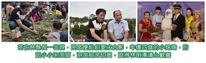 「2016南投世界茶業博覽會」10月8日起在中興新村登場,年僅4歲的小妹妹,扮起小小泡茶師,泡茶給茶伯林明溱縣長喝,逗得林縣長滿心歡喜。開幕活動中,林縣長也頒發縣長茶特等獎予清香組的賴士墉及熟香組的陳智賢,並邀請全國民眾到南投體驗找茶趣、喝好茶。