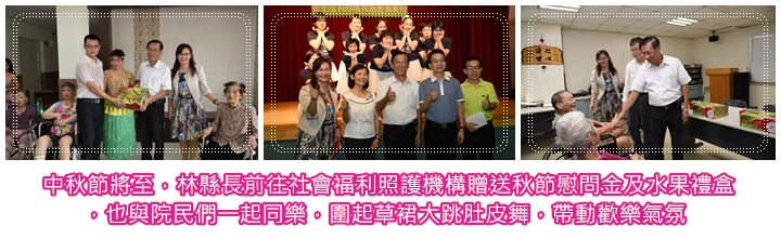 中秋節將至,為關懷縣內委託安置低收、中低收、遊民及兒少院民,縣長林明溱9月12日前往新泰宜婦幼醫院附設護理之家、衛生福利部南投啟智教養院及私立博愛護理之家等3家社會福利照護機構贈送秋節慰問金及水果禮盒,到博愛護理之家慰問時,林縣長也與院民們一起同樂,圍起草裙大跳肚皮舞,帶動歡樂氣氛。
