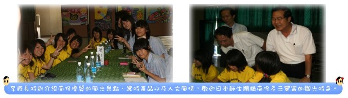 在縣府與國際教育交流聯盟總會的積極接洽下,日本四日市西高校繼去(96)年10月間到南投與國立中興高中進行教育交流後,該校師生10月22日在校長谷口正夫的領隊下,再度蒞縣展開修學旅行,縣長李朝卿親自出席歡迎會,中興高中以優美的吉他演奏及精彩的布農族打耳祭八部合音舞蹈表示歡迎,四日市西的學生則報以熱烈的掌聲,感謝縣府及中興高中的熱情接待。