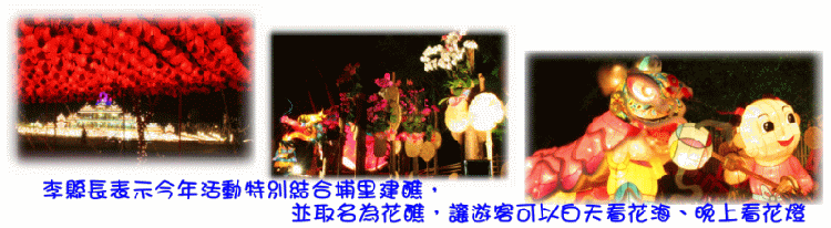 | .相關新聞:2008花卉嘉年華 | | .相關新聞:2008南投花卉嘉年華暨名間鄉農產業文化系列活動-「名間萬丹賞花趣」 | | .相關新聞:2008南投花卉嘉年華-踏雪尋梅系列活動開鑼 | | .相關新聞:2008集集環保嘉年華-資源回收、節能減碳暨節約用水宣導」活動 | | .相關新聞:『2009南投燈會---集集鄉土燈展』花燈認養作業要點 請踴躍參與 | | .相關新聞:2009年日月潭跨年祈福系列活動預告 |