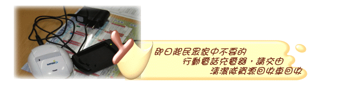 您是否曾在更換新款式的行動電話,汰換後舊充電器不知如何處理呢?環保署已於97年10月30日公告修正「執行機關一般廢棄物應回收項目」,將廢行動電話充電器納為「資源」,即日起民眾家中不要的行動電話充電器,必須分類為「資源」並交由清潔隊資源回收車回收,不可混入垃圾中丟棄,若經清潔隊勸導後仍執意丟入垃圾車中,將被處以新臺幣1,200至6,000元罰鍰。