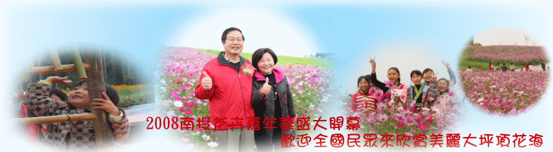 2008花卉嘉年華活動6日於埔里鎮大坪頂正式開幕,佔地近30公頃的大坪頂花海幅員廣闊,色彩繽紛、層次分明,吸引許多來自全國各地的民眾一同來賞花,相當熱鬧。縣長李朝卿伉儷特別率縣府各一級主管前往賞花,並歡迎全國民眾一起來賞花。此次活動代言人蕭煌奇則現場獻唱活動主題曲「幸福的氣味」等3首歌曲,讓賞花民眾沉浸在美麗花海與優美歌聲中。 李縣長特別向所有遊客介紹今年花卉嘉年華活動特色,他表示,今年活動特別結合埔里建醮,並取名為花醮,讓遊客可以白天看花海、晚上看花燈。今年花卉嘉年華也不同以往,不僅大坪頂花海增加為今年30公頃,各鄉鎮也群起呼應,各自展現不同的花海景觀。
