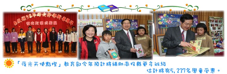 教育部去年試辦「夜光天使點燈專案」,讓貧困、單親及弱勢家庭學生在下課後可以得到照顧,經過20週來的努力也進行成果的展示,李縣長伉儷對弱勢學童的課後照顧十分重視,南投縣不但在去年是全國辦理「夜光天使點燈」班數最多的縣市,教育部今年預計將補助南投縣更多班級,估計將有5,237名學童受惠。