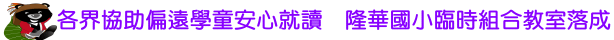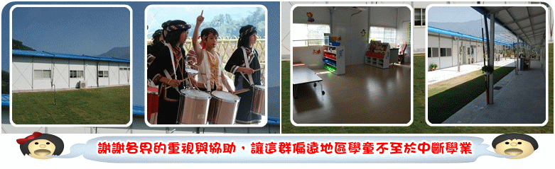 南投縣信義鄉神木村隆華國小校舍於莫拉克颱風中遭到重創沖毀,為使該校及所屬幼稚園的學童得以安心就讀,在中悅建設、竹城建設及紅十字總會等各企業、團體協助下,組合教室順利完成,10月21日在新組合教室舉行臨時校舍認捐儀式暨重陽敬老活動,由副縣長陳志清頒發感謝狀,感謝中悅建設等團體的協助、 |