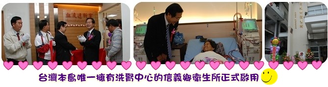 台灣本島唯一擁有洗腎中心的信義鄉衛生所11月18日舉行揭牌啟用儀式,縣長李朝卿前往主持,並與現場來賓一起為血液透析中心揭牌,李縣長也親自到病房內探視正在洗腎的病患們,一一關心探詢每位病患的意見和健康情形。他期許新成立的洗腎中心,除方便病友的就醫外,亦能提供信義鄉親更為完善便利的醫療服務。