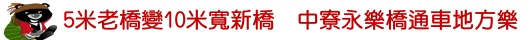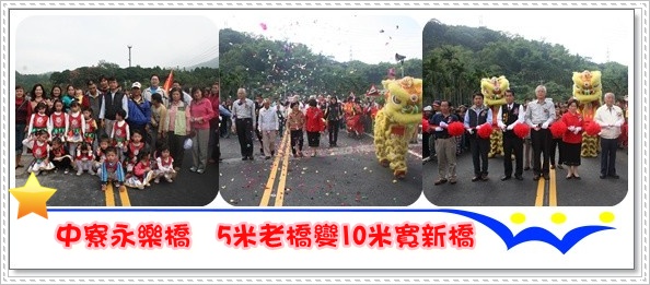 中寮鄉永樂橋11月21日辦理通車典禮,5米寬的舊橋變成10米寬的新橋,副縣長陳志清代表縣長李朝卿牽著和興村90多歲的鄉親一起走過新橋,大批中寮鄉民也參加這項活動,歡慶通車。中寮鄉永樂橋拓寬峻工通車活動,在舞獅表演、和興國小學生演奏及鞭炮助陣下,中寮寧靜山區裡,引起不小的騒動,副縣長陳志清牽著和興村92歲的徐阿貴、90歲的徐范真妹等人走過新橋,鄉民扶老攜幼簇擁在後,踏在新橋上,共同體驗永樂橋通車的喜悅。