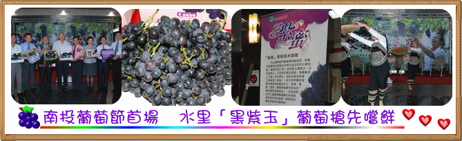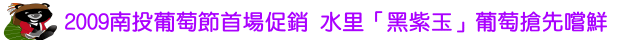 2009南投縣葡萄節首場促銷展售活動,11月14日在水里鄉農會廣場展開,除可品嚐鮮美多汁的「黑紫玉」葡萄外,現場也對水里、信義、竹山、草屯和集集等五鄉鎮所產葡萄進行「葡萄王」評鑑。比賽共計50個農戶參加,縣府希望藉由葡萄節的評鑑、品嚐與展售促銷,全面提升南投縣葡萄知名度,吸引更多消費者採購南投新鮮葡萄。