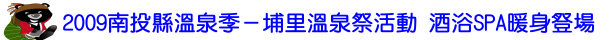 備受大家期待的「2009南投縣溫泉季」,10月24日下午於埔里鎮鯉魚潭天泉溫泉會館,由埔里溫泉祭活動-酒浴SPA開幕作為暖身。活動現場除有酒粕溫泉池、奈米牛奶湯及玫瑰溫泉池等獨特溫泉供參加來賓體驗外,還有創意溫泉拉麵免費供民眾品嚐。相關系列活動於11月7日展開到明年1月3日,活動內容精彩豐富,喜歡泡湯的民眾一定不能錯過!