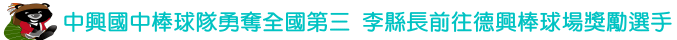 南投縣中興國中棒球隊於全國軟式青少棒聯賽中勇奪第三名,縣長李朝卿、南投縣棒球委員會主任委員游宏達、縣府教育處長劉仲成等人特別前往德興棒球場給於球員嘉勉,李縣長並特別致贈20箱運動飲料及果菜汁以示鼓勵,並期勉該球隊再接再厲,再創佳績為本縣爭光。