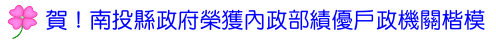 南投縣政府民政處辦理各項戶政業務並督導各戶政事務所提昇服務品質,深受內政部肯定,繼96年獲頒「戶政機關楷模」後,今年再次榮獲該獎項,是全國25個直轄、縣(市)中,最快再次獲得該獎項之機關。