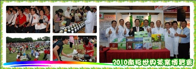 2010南投世界茶業博覽會6月19日上午在中興新村盛大舉行!縣府在活動現場規劃了100個農產、原住民特產、工商文化展售攤位,一早就吸引大批民眾前往參觀採買。中興會堂內設有92個茶葉展售專區,世界各地好茶齊集,吸引來自各地愛茶遊客前來品茶。傍晚一場「千人茶會」,2千多人以茶會友,台灣區南投縣同鄉會聯合總會舉辦「鳳還巢」體驗營,一時之間茶香四溢!
