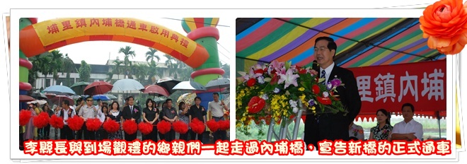 經過地方多年爭取,埔里鎮內埔橋終於在6月14日舉行通車啟用典禮,縣長李朝卿、立法委員馬文君、縣議員許阿甘、王彩雲、吳國昌、廖志城、戴世詮、黃志學、鎮長周義雄等貴賓都到場參加,並進行剪綵儀式;隨後在鑼鼓聲、舞獅陣的引導下,李縣長與到場觀禮的鄉親們,在大雨中一起走過內埔橋,宣告新橋正式通車。