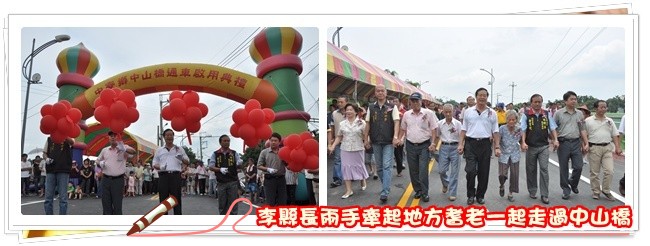 中寮鄉投139線中山橋6月20日上午舉行通車典禮,由縣長李朝卿親自主持,中寮鄉現任鄉長張永輝、前任鄉長陳月英同時出席,共同見證這項法會,地方民眾參加非常踴躍,李縣長牽起地方耆老廖寸、廖曾不夫妻,在祥獅陣引導下歡喜走過中山橋,鑼鼓聲加上鞭炮聲,相當熱鬧。