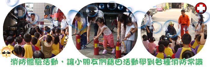 此次宣導安排了消防常識、消防車輛介紹、消防衣帽鞋穿戴、濃煙體驗、水滅火器、受理報案情形等項目,活動內容豐富有趣,在各項活動中,小朋友們最喜歡的莫過於水滅火器及濃煙體驗。藉由玩水,讓小朋友們了解滅火器「拉、拉、壓」的操作方式,在火場慌亂中不會直接把滅火器丟進火源中;而進入濃煙體驗室,使小朋友們能夠體驗在火場中,遇到大濃煙要如何的逃生,也因有了今次的體驗,往後遇到災害時不至於慌亂過度,畢竟,多一分了解,多一分保障,此次活動讓小朋友對防火觀念更加了解。