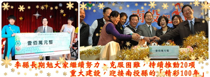 「南投起飛,航向國際新願景」!縣府於12月20日在大禮堂舉辦縣長李朝卿2010年終記者會,別開生面以「耶誕餐會」方式,鄭重為南投縣獻上了「傳承」、「創新」、「國際化」3道特餐;李縣長除了分享重要施政成果及方向,也端出了「300好禮」,邀請國內外運動好手在建國100年,一起到南投挑戰「國際超級鐵人3項系列賽」100公里,贏取破國內紀錄、第1名100萬元的超高額獎金。