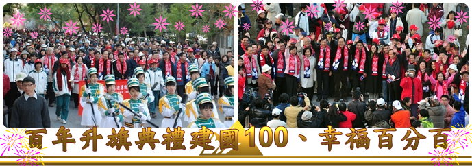 縣府精心籌劃的建國百年元旦升旗典禮活動,1月1日清晨在1萬多人的參與見證下,將全國最大的40公尺長巨幅國旗緩緩升起;操場中央則由中興高中等縣內7所學校師生共2,230人分別戴上藍、白、紅色帽子和5,400斤柳丁排成了「台灣100」的大型拼圖,壯觀的畫面讓每個參與的貴賓與民眾都相當感動。縣長李朝卿表示,過去一年是幸福久久、南投縣政豐收的一年,而精采100年,則是幸福百分百。