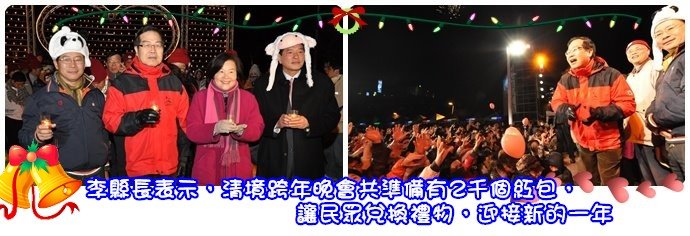 邁向民國百年!99年12月31日晚間,縣長李朝卿伉儷率縣府一級主管,在清境農場遊客休閒中心第一停車場,和2萬名遊客一起在99年的最後一分鐘開始倒數。在100年到來之時,天燈及心型氣球冉冉升空,燦爛煙火頓時照亮清境地區。雖然氣溫僅僅6度,但所有人熱情歡呼,幾乎忘了低溫,讓新年第一天一開始就high到了最高點!