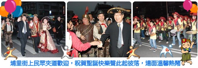 2010南投花卉嘉年華鄉鎮系列活動-魅力森巴fun埔里暨閃耀聖誕舞動狂歡活動,12月25日在埔里鎮仁愛路埔里智慧館前熱力展開,縣長李朝卿出席主持開幕式與埔里民眾歡渡聖誕佳節。李縣長、議會副議長潘一全、埔里鎮長周義雄和與會嘉賓們,都打扮成各種不同的華麗造型,為活動掀起高潮,也為埔里鎮點燃歡樂的聖誕氣氛。