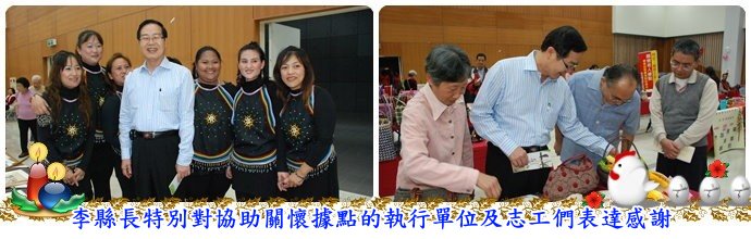 縣府12月15日於縣府大禮堂舉辦社區照顧關懷據點成果展,邀集縣內78個據點、約200多人參加,現場除了靜態展示各照顧據點長者們平日創作的作品外,長者們也上台表演各種才藝,展現出老人家健康活潑的一面。縣長李朝卿也到場頒獎表揚今年社區照顧關懷據點服務績優社區單位。李縣長也對協助關懷據點的執行單位及志工們表達感謝,由於大家的付出和努力,讓本縣社區照顧關懷據點的服務績效榮獲全國第一,相當不簡單。