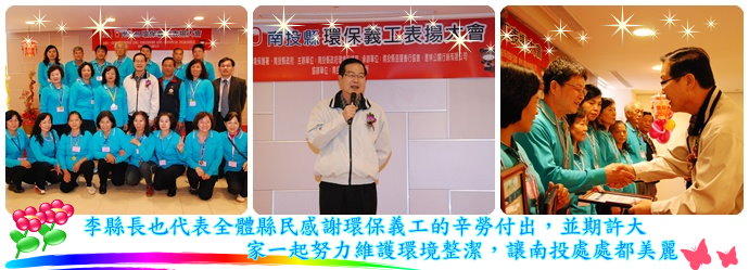 縣府環保局12月5日在埔里鎮平雲山都舉辦「2010南投縣績優環保義工表揚」頒獎典禮,縣長李朝卿出席頒獎表揚全縣264名績優義工,李縣長致詞時表示,全縣環保義工平日在各角落,不辭風雨、默默付出,肩負維護社區環境清潔的工作,讓社區乾淨又美麗,李縣長也代表全體縣民感謝環保義工的辛勞付出,並期許大家一起努力維護環境整潔,讓南投處處都美麗。
