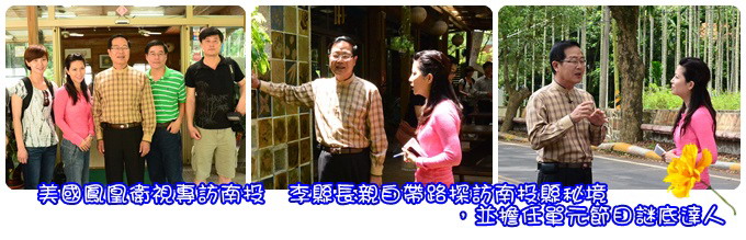 美國鳳凰衛視「瞰台灣」主持人沈玫琦4月24日帶領製作團隊到南投縣取景,介紹南投好山好水,縣長李朝卿親自帶路探訪南投縣秘境,並擔任單元節目謎底達人。