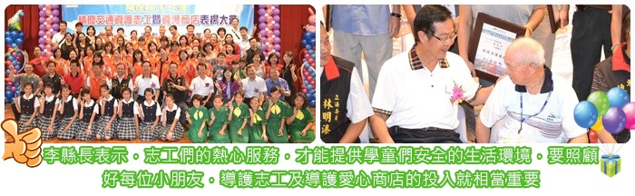 李縣長表示,今(101)年本縣共有1,134位導護志工和3,70家導護商店協助維護學童安全,受獎的各位志工們,更是長期投入導護工作多年,表現亮眼。竹山鎮前山國小鄭秀霞志工服務時數最多,高達410小時,還有集集鎮隘寮國小施美合志工201小時及竹山鎮竹山國小戴文俞志工200小時等,而南投市平和國小張清祥先生服務21年,這些成果,如沒有犧牲服務精神是不可能做到的。