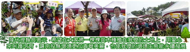 縣府每年都會和南投林管處合辦植樹活動,將一棵棵苗木種植在我們的土地上,用愛心來呵護培育,讓南投縣環境更加青翠美麗,也使我們的環境生態能永續發展。