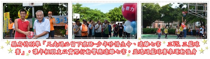為使年輕人有「反霸凌、反毒品、反幫派、反暴力、反援交、反飆車、反菸害」的決心,縣府警察局、教育處、衛生局、社會處、救國團南投縣團委會7月27日於國立南投高中聯合舉辦102年南投縣「凡走過必留下痕跡─少年珍惜生命、遠離七害 三VS.三籃球賽」,秘書長陳朝旺特地前往參與,鼓勵青少年朋友於暑假期間培養正當休閒活動。