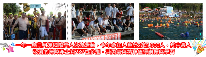 吳敦義表示,參加日月潭泳渡,可以飽覽南投湖光山色,還有美食可以品嚐。早上七點起,237位身障泳士打前鋒,做完暖身操後,一波接著一波下水,來自台中市身障的陳永勝,再次勇奪第一,完成六連霸壯舉。陳永勝說,他參加日月潭萬人泳渡活動,今年是第12年,今年以36餘分的時間完成3千公尺,他的成績是歷年來最好的一次。