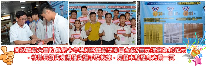 本縣體育界今年度可說大豐收,縣內子弟兵在全國中等學校運動會、全國原住民族運動會、全國女子壘球甲組聯賽總共囊獲49金37銀24銅,成績亮眼。為鼓勵傑出選手,縣府今年特別將體育獎助學金從7萬元提高為10萬元,並於5月19日舉辦表揚茶會,由縣長林明溱頒獎表揚獲獎選手及教練,見證本縣體育光榮一頁。