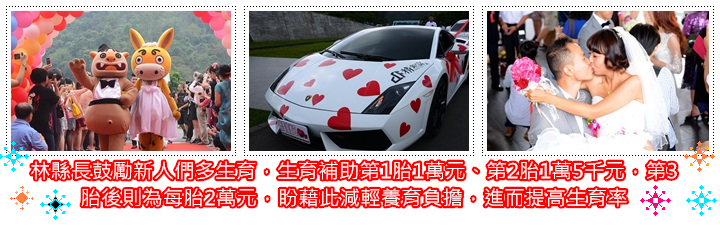 林縣長表示,擔任縣長後為鼓勵生育,已提高縣內生育補助,第1胎1萬元、第2胎1萬5千元,第3胎後則為每胎2萬元,盼藉此減輕養育負擔,進而提高生育率。此外,縣府及贊助單位準備許多禮物贈與新人外,也特別請同德家商學生到場烹煮美味料理,並為新人化妝打扮,讓新人亮麗登場。