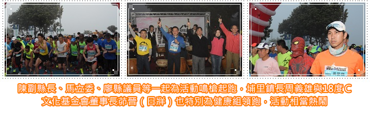 陳副縣長表示,活動內容結合了地方產業推廣,相當特別,未來希望能多舉辦類似活動,透過體育行銷南投。鎮長周義雄表示,本次活動是埔里鎮首度舉辦的全國性馬拉松賽事,加上志工人員,現場參加人數高達6千人,11月27日還有一場馬拉松比賽,歡迎大家再度蒞臨埔里鎮。