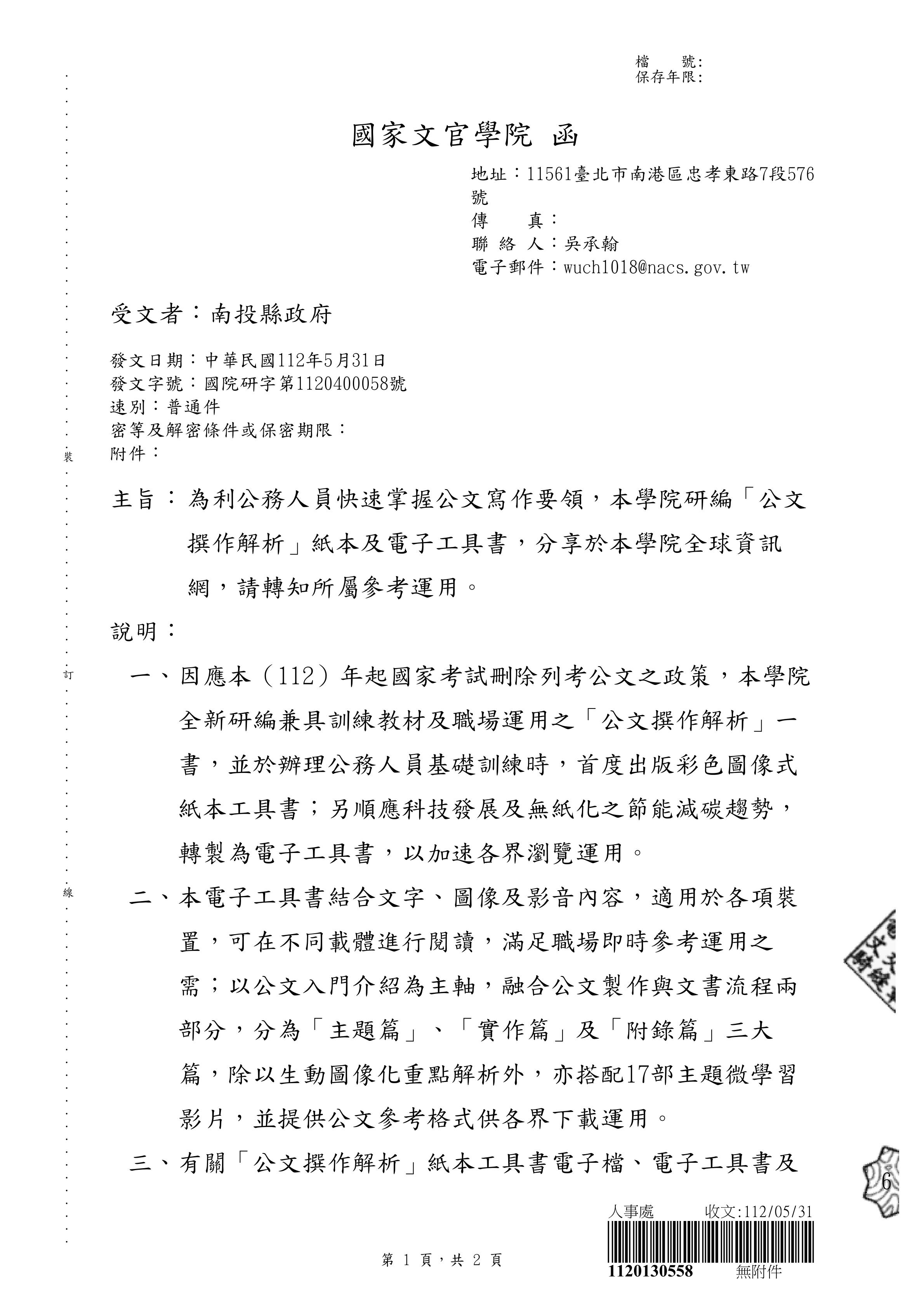 為利公務人員快速掌握公文寫作要領,國家文官學院研編「公文撰作解析」紙本及電子工具書,歡迎參考運用。