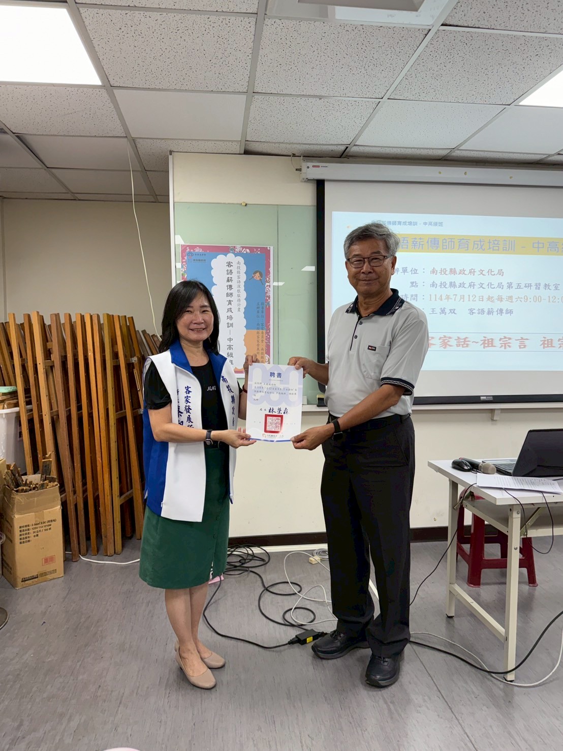 為推動客語永續發展與傳承,南投縣客家發展所(以下簡稱本所)於今(114)年7月12日起至9月27日止,每週六上午9時至12時於南投縣政府文化局研習教室五辦理「客語薪傳師育成培訓-中高級班」,吸引眾多熱愛客家文化與語言的學員踴躍報名參與。