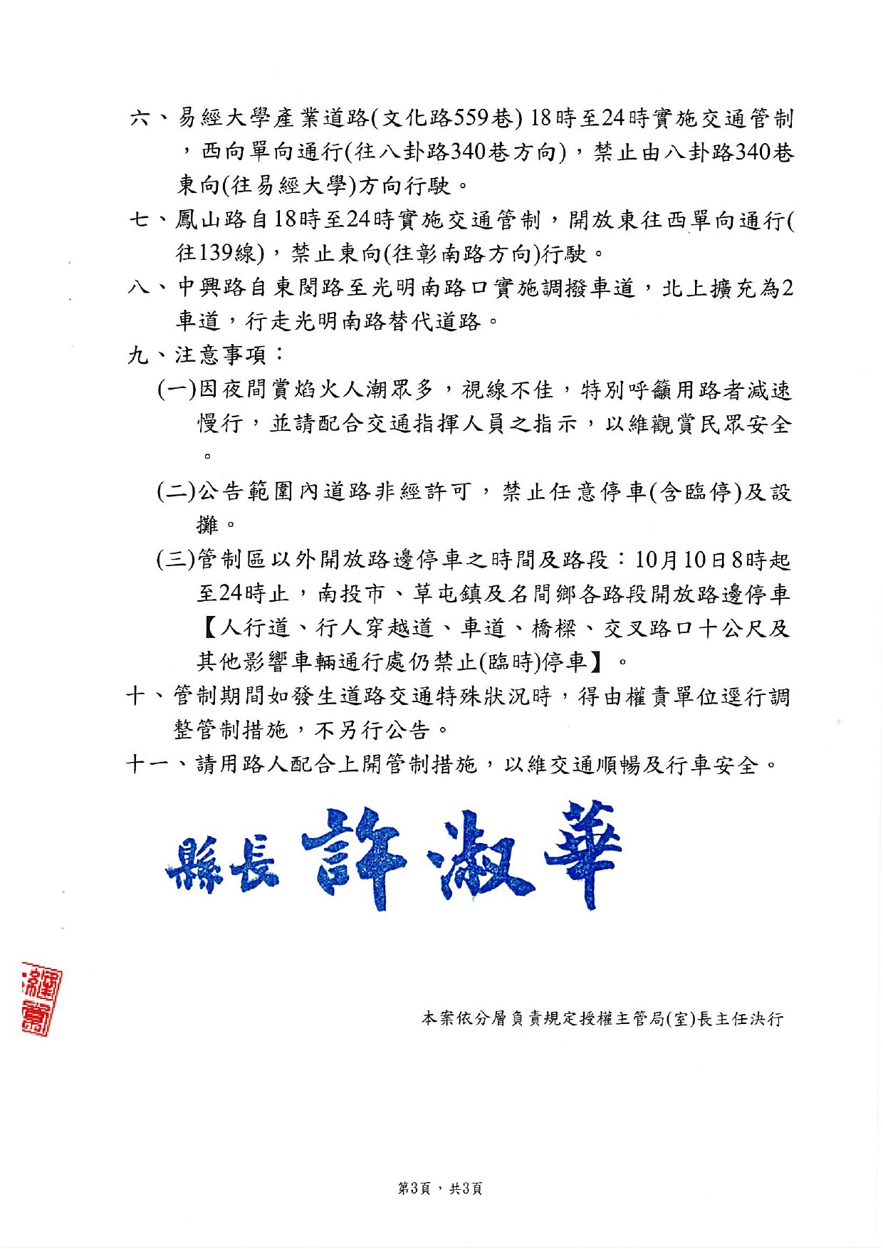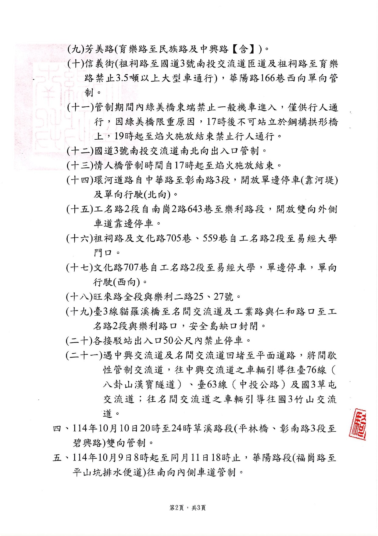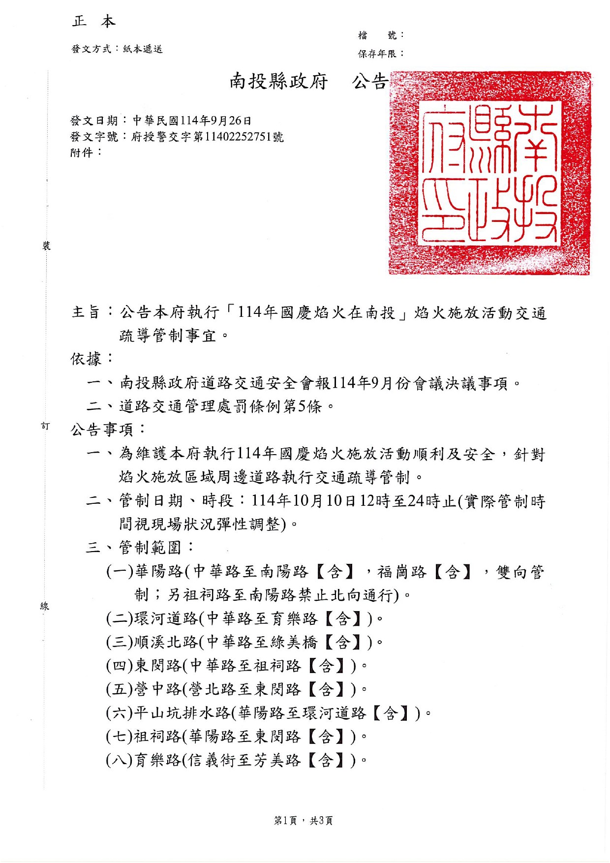 「114年國慶焰火在南投」焰火施放活動交通疏導管制公告