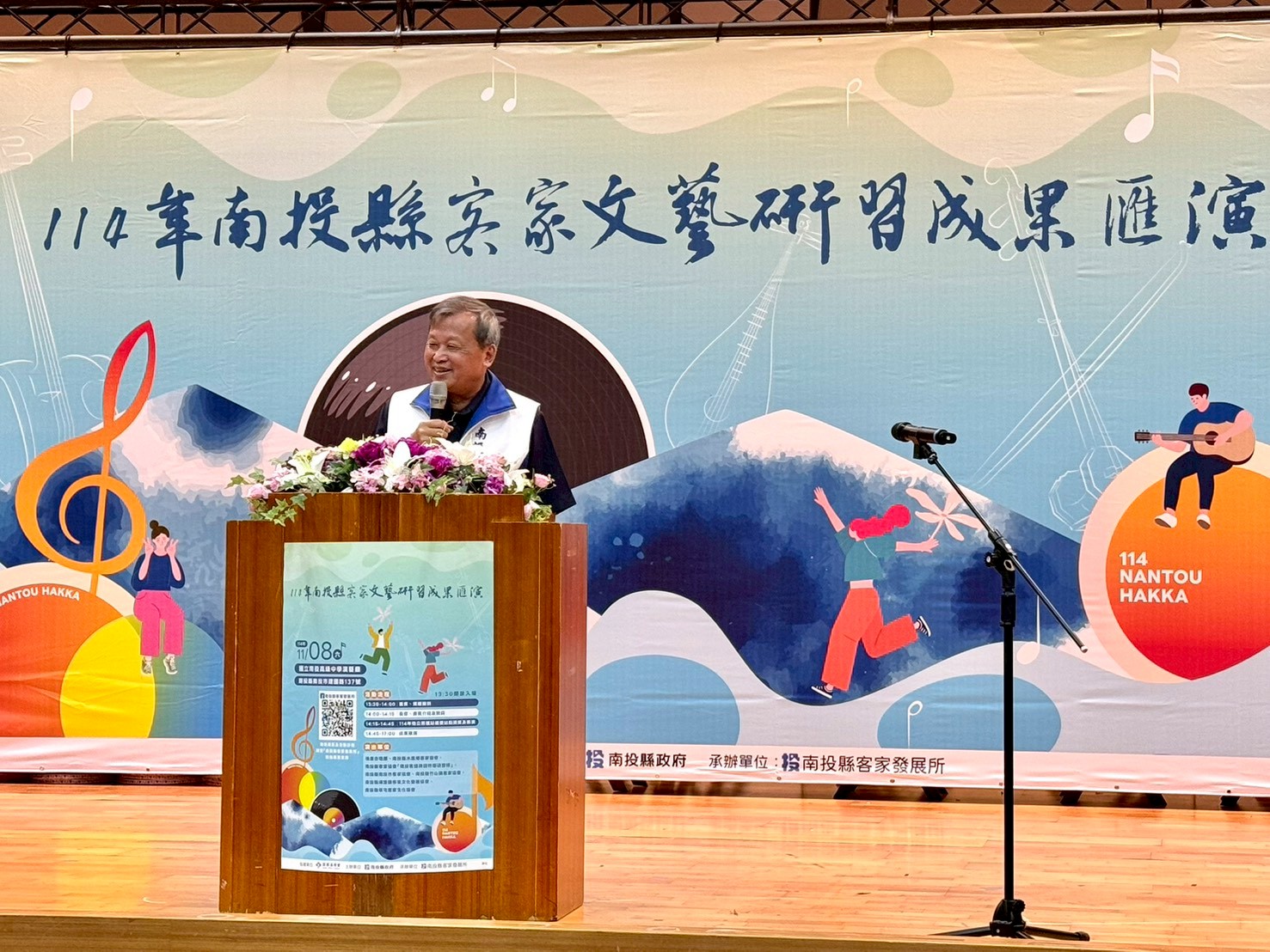 南投縣政府自112年起配合客家委員會持續辦理「客家文藝研習計畫」,邀集縣內各社團共同參與,透過開設客家歌謠班及相關課程,讓學員在輕鬆的學習氛圍中體驗客家語言與音樂之美。此次成果匯演不僅是課程的成果展現,更是文化傳承的重要象徵,為推動客家藝文發展再添新頁。