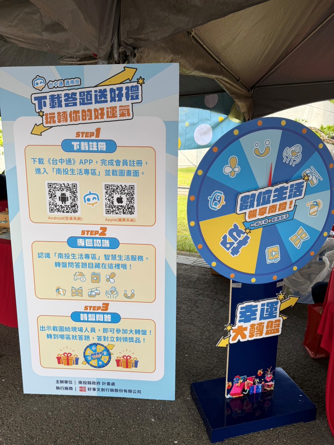 生活推廣站打破傳統政策宣導模式,以「好拍、好玩、好康」三大亮點打造互動體驗。民眾只要完成APP下載註冊,即可挑戰「幸運轉盤」,帶走限定紀念小物,每款小禮物都與南投生活專區的數位服務內容息息相關,趣味滿分!現場還結合「衝現場・抽好禮」線上活動,完成任務即可抽中「漢來日月行館住宿券」等人氣大獎,現場氣氛嗨翻,話題不斷延燒!