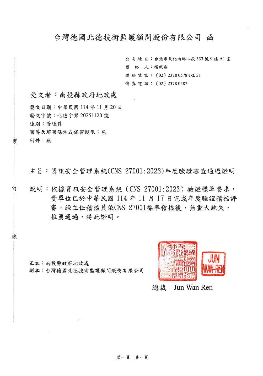 地政機關資訊系統保存大量民眾財產及個人資料,不容被竊取或竄改,地政服務也不容中斷,且為符合行政院「政府機關(構)資通安全責任等級分級作業規定」資安B級機關應辦事項規定,地政處及所屬各地政事務所自106年8月開始導入ISMS資訊安全管理系統,本年度持續辦理國際標準驗證,由驗證公司指派2名稽核員前來地政處辦理全日稽核,經稽核後符合驗證標準,發給證明。