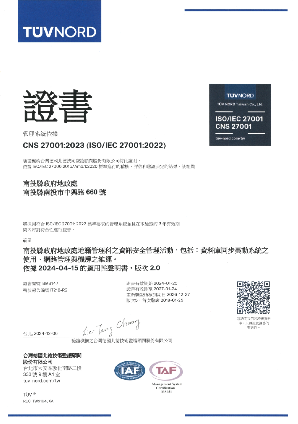 地政處及所屬各地政事務所地政資訊業務導入ISMS (資訊安全管理系統,Information Security Management System,ISO國際認證標準的一種)制度並通過國際認證,進而全面提升人民財產安全與地政資訊的服務品質。